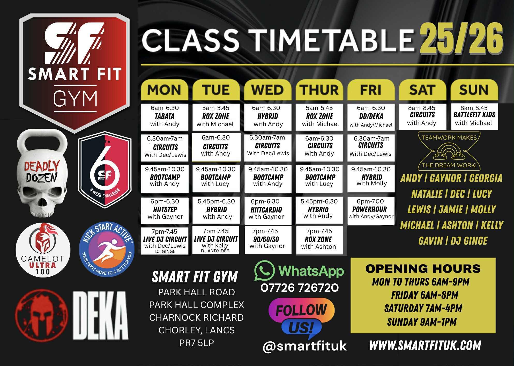 Monday 8pm , Tuesday 8pm, Thursday 8pm and Friday at 7pm after which your second week you will attend a minimum 3-4 mainstream classes per week for the duration of the 6 week challenge.